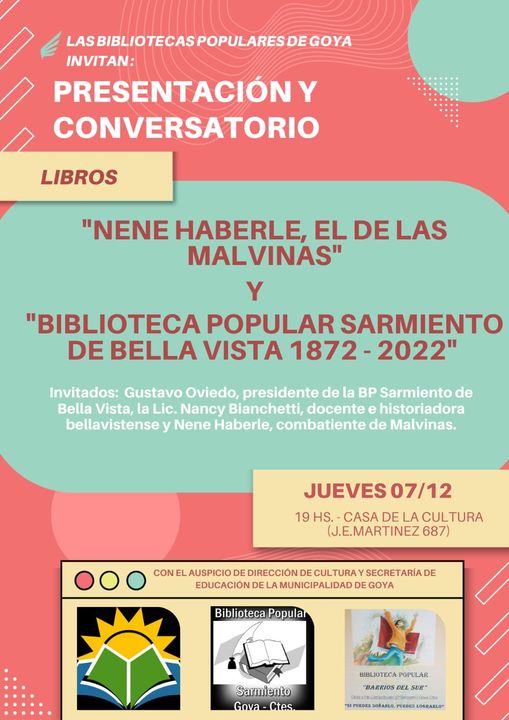 Casa de la Cultura Juan Esteban Martínez 365, Goya, CorrientesCon mucho orgullo, desde las Bibliotecas Populares de Goya: “Marta Elgul de París”, “Barrios del Sur” y “Domingo F. Sarmiento” se invita a la presentación de dos libros provenientes de la localidad vecina de Bella Vista. Con invitados de honor: Nene Haberle, combatiente de Malvinas y protagonista de una de las obras a presentarse, el ... Leer más